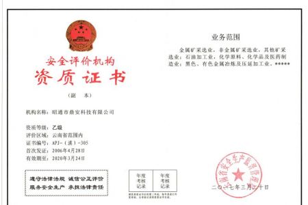 2003年11月10日,昭通市鼎安科技有限公司成立,初始主要從事第三方安全工程技術(shù)服務(wù),經(jīng)多年運(yùn)營,發(fā)展為多專業(yè)綜合科技平臺,為社會提供多種專業(yè)技術(shù)服務(wù)工作。 現(xiàn)公司注冊資金為1200萬元,公司法定代表人:毛衛(wèi)旭。公司主要業(yè)務(wù):安全評價、安全標(biāo)準(zhǔn)化評審、安全工程技術(shù)服務(wù);環(huán)境監(jiān)測、職業(yè)衛(wèi)生檢測、檢驗(yàn);法律訴訟及非訴訟服務(wù);司法鑒定、固定資產(chǎn)投資項目節(jié)能服務(wù);工程咨詢;工程測量測繪;安全教育培訓(xùn)等。是安全生產(chǎn)服務(wù)、安全教育培訓(xùn)機(jī)構(gòu),也是環(huán)境監(jiān)測和職業(yè)衛(wèi)生服務(wù)機(jī)構(gòu),同時也是綜合的檢測檢驗(yàn)、綜合科技平臺服務(wù)機(jī)構(gòu)。多年來為公、檢、法、司、軍、警、海關(guān)、仲裁、安監(jiān)、工礦商貿(mào)企業(yè)、社會團(tuán)體及個人提供多專業(yè)技術(shù)服務(wù)。